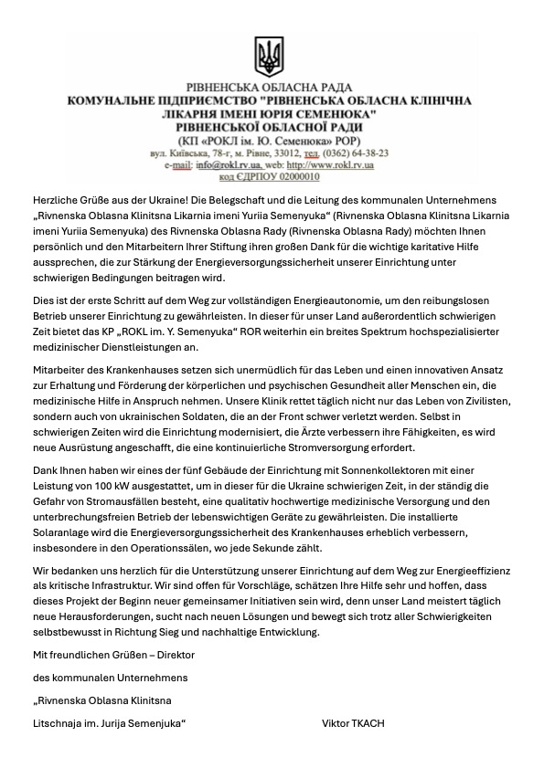 - Ziel ist, 2026 mind. ein Dutzend Krankenhäuser in der Ukraine mit ähnlichen notstromfähigen PV-Systemen zu versorgen – wenn das Spendenaufkommen es ermöglicht, auch mehr.